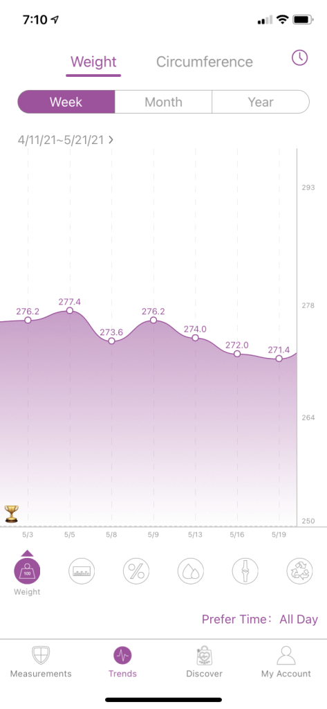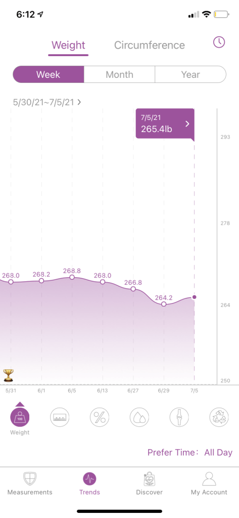 My weight is my so far as of 7/5 I hit 265.4. My goal for the end of June was 265.